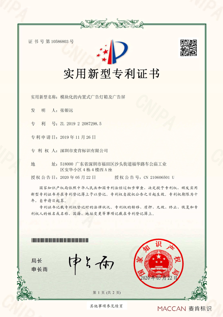 近日,麥肯標(biāo)識(shí)申請(qǐng)的中洲濱海商業(yè)中心410㎡燈箱廣告“模塊化的內(nèi)置式廣告燈箱及廣告屏”得到國(guó)家知識(shí)產(chǎn)權(quán)局認(rèn)證,榮獲“實(shí)用新型專利證書”。