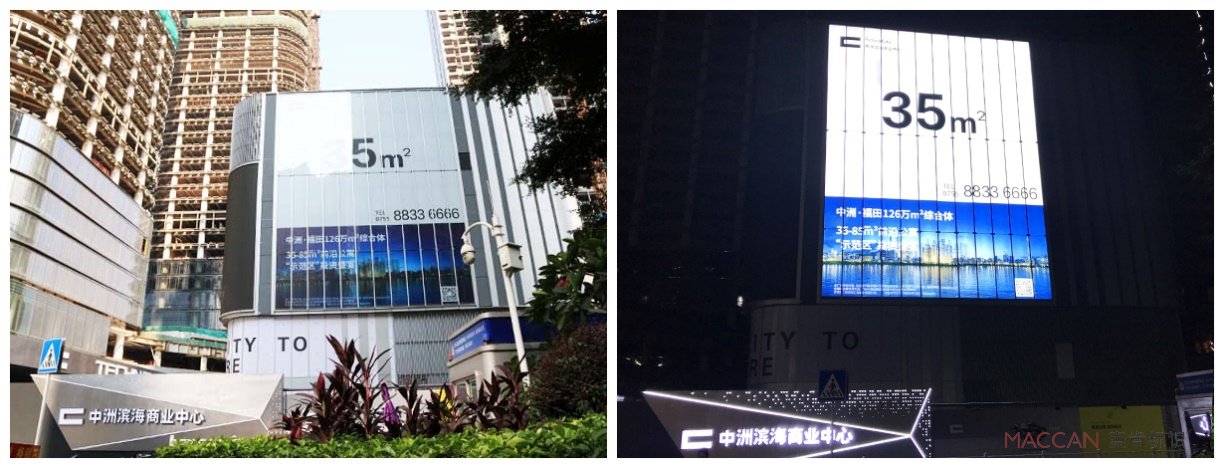 通過克服技術(shù)難點(diǎn),從材料進(jìn)場(chǎng)到現(xiàn)場(chǎng)施工準(zhǔn)備再到落地施工,中洲濱海商業(yè)中心410㎡燈箱廣告獲得明顯超越常規(guī)動(dòng)感燈箱的優(yōu)異視效。