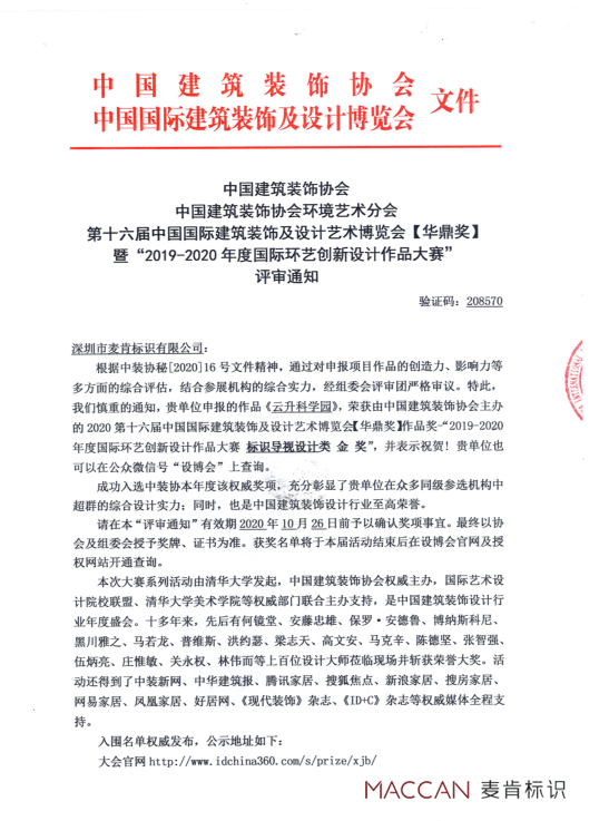 第十六屆設(shè)博會【華鼎獎】,麥肯標識從國內(nèi)外數(shù)千套優(yōu)秀作品中脫穎而出,【云升科學園】項目被評選為2019-2020年度國際環(huán)藝創(chuàng)新作品獎金獎。