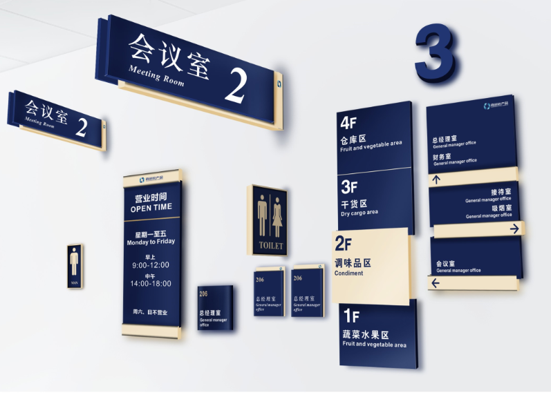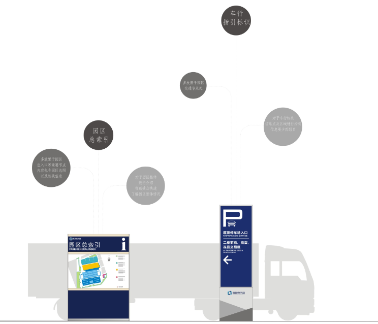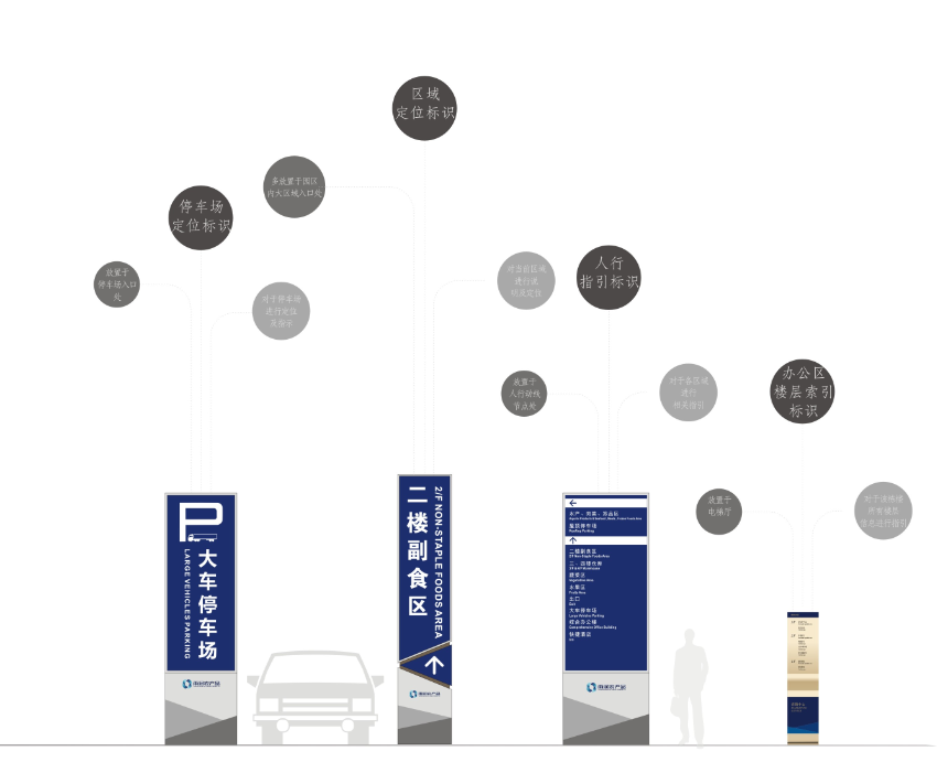 以藍白色為主調,很符合工業(yè)園區(qū)環(huán)保簡潔氛圍,整體系統(tǒng)簡潔大方。將其功能性發(fā)揮到最大化。在直觀明了的導視牌面輔以三維化導視牌,讓路癡的你也有了方向感。