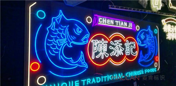 麥肯打造的陳添記霓虹店招,高明度的色彩具有很強(qiáng)的視覺沖擊力,時(shí)髦又復(fù)古,遠(yuǎn)遠(yuǎn)就能被吸引。