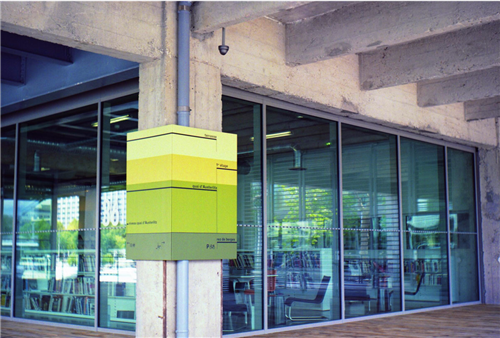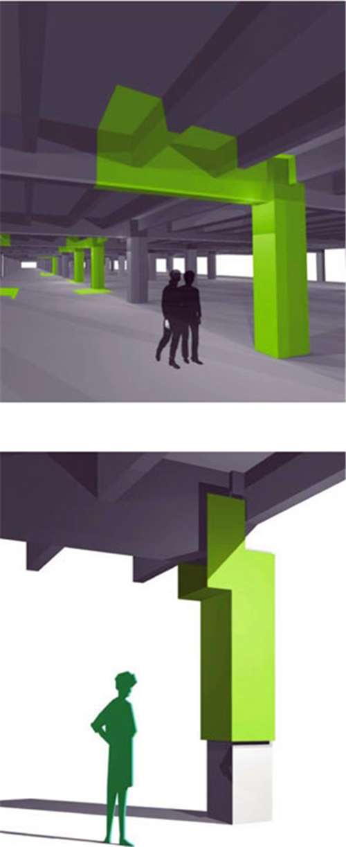 這個(gè)導(dǎo)視系統(tǒng)的設(shè)計(jì)與以往不同的是,設(shè)計(jì)的載體不能妨礙人們散步或休閑。系統(tǒng)中采用綠色作為主色調(diào),新選用的顏色在視覺上與建筑主體要有主次之分,也要考慮到與建筑主體本身的水泥相協(xié)調(diào)。
