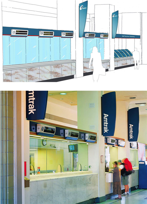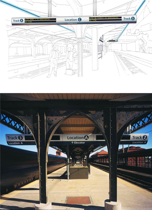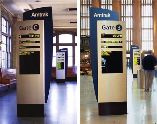 C&VE工作室為阿西樂車站設(shè)計(jì)了一套導(dǎo)視系統(tǒng),將該導(dǎo)視系統(tǒng)作為Amtrak的高速運(yùn)營(yíng)服務(wù)品牌,并打造了一個(gè)具有凸顯品牌特色的形象。通過對(duì)旅客在使用Amtrak服務(wù)之后的調(diào)查表明,從站外買票,進(jìn)入大廳,再到月臺(tái)的整個(gè)過程,這套導(dǎo)視系統(tǒng)都發(fā)揮了其應(yīng)有的作用。