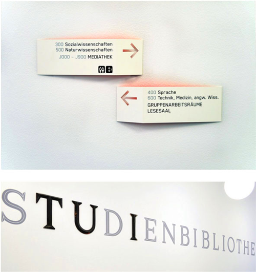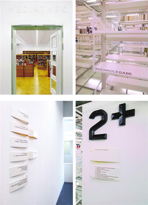 圖書(shū)館的導(dǎo)視系統(tǒng)應(yīng)該使用大型的字體設(shè)計(jì),利用明亮的顏色等夸張的設(shè)計(jì)手法來(lái)提示讀者準(zhǔn)確的位置。