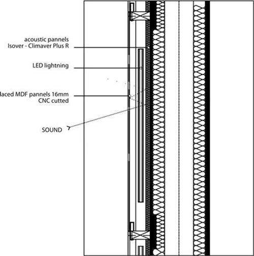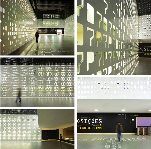 P-06 ATELIER設(shè)計(jì)工作室和建筑設(shè)計(jì)師Jo?o Luís Carrilho da Gra?a合作,對一個多功能的教學(xué)實(shí)驗(yàn)室和一個名為“知識庫”的科學(xué)博物館進(jìn)行環(huán)境標(biāo)識的設(shè)計(jì)。設(shè)計(jì)的目的就是在垂直的空間里,利用不同的材料組成一個穿孔墻一樣的裝置,讓這個空間充滿了不同的聲音和折射出來的光,主題就是讓整個博物館猶如一個信息交換的中心,大家都可以實(shí)現(xiàn)信息共享。通過不同圖案的大小、聲音的強(qiáng)弱和空間的寬闊程度,設(shè)計(jì)師甚至在保持室內(nèi)光線充足的情況下,設(shè)置了白色的LED顯示屏。