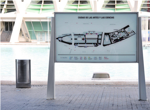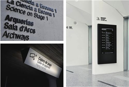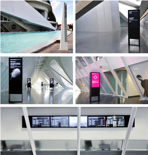 導(dǎo)視系統(tǒng)完美地結(jié)合了Calatrava的建筑風(fēng)格,設(shè)計(jì)師對博物館進(jìn)行了全面的導(dǎo)視系統(tǒng)設(shè)計(jì),導(dǎo)視系統(tǒng)的靜態(tài)裝置和流動裝置都利用了新型的計(jì)算機(jī)技術(shù),做成了30個圖案信息導(dǎo)視裝置。