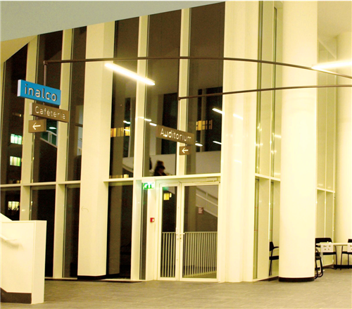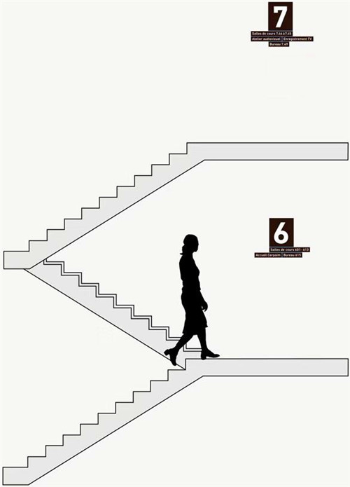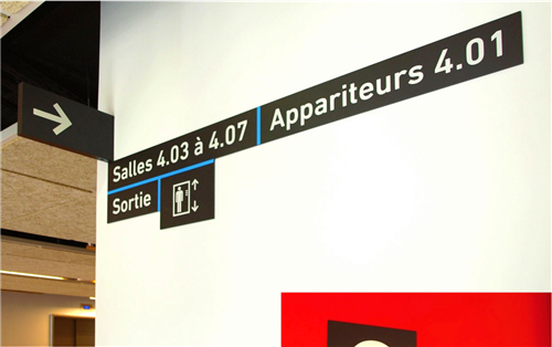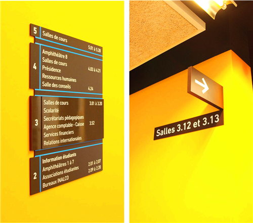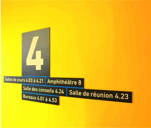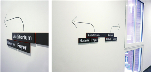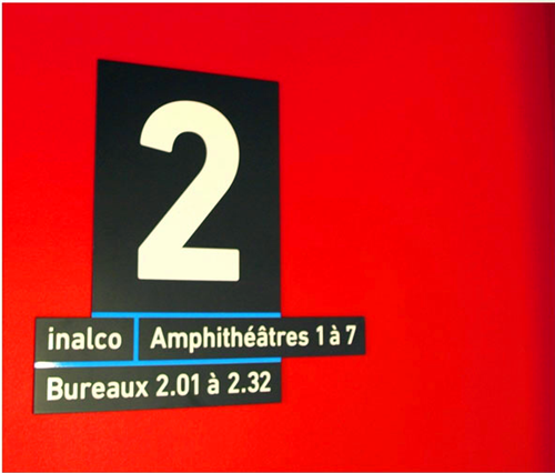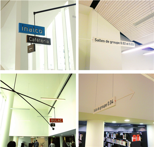 導視系統(tǒng)的視覺設(shè)計反映了這兩個功能區(qū)域的特色,而且建筑物的瓷磚就是一個很好的例子,一邊是米黃色,一邊是白色。設(shè)計師在大堂內(nèi)部設(shè)計了一個導視的十字裝置,用以區(qū)分BULAC和INALCO區(qū)域,它告訴游客主要的方向和大樓內(nèi)部的功能區(qū)域。