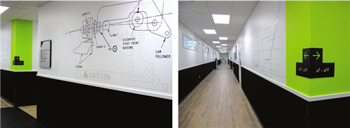 導視系統(tǒng)和環(huán)境標識設(shè)計都利用了現(xiàn)代新式化學為設(shè)計材料,目的是為了營造一種當時科學的時代氣息的同時,激發(fā)學生對學習的興趣。