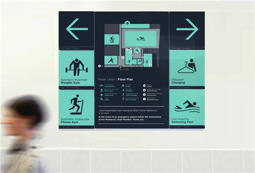 Detail.設(shè)計工作室為都柏林休閑中心設(shè)計了一套標識和導視系統(tǒng)。設(shè)計團隊還與設(shè)計師McGarry Ní éanaigh和建筑設(shè)計師Donnelly Turpin共同合作,設(shè)計一套人形的插畫標識。全套導視系統(tǒng)遍布了中心的各個角落。