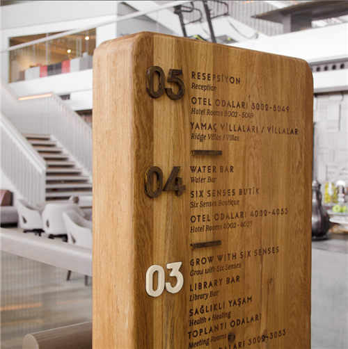 基于酒店名Six Senses,F(xiàn)ederation設(shè)計(jì)機(jī)構(gòu)設(shè)計(jì)了六個(gè)簡約的不規(guī)則圓點(diǎn)logo,象征著六種感覺。精神堡壘為流暢的立體折面,在內(nèi)部設(shè)計(jì)了藍(lán)色的氛圍燈光,具有神秘感。戶外立式導(dǎo)視板由不規(guī)則木材和石材結(jié)合,擁有彎曲的線條,特別的是,在連接處設(shè)計(jì)了燈光照明,具有裝飾作用。室內(nèi)采用較厚的圓角方形木材和石材相結(jié)合,具有厚重感,配色溫和,打造了優(yōu)雅的酒店環(huán)境。