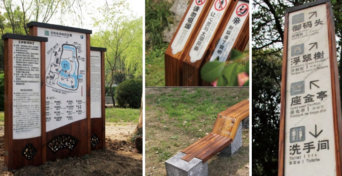 標(biāo)識(shí)系統(tǒng)設(shè)計(jì)在選材時(shí)應(yīng)考慮生態(tài)環(huán)保,結(jié)合材料的加工性能、耐候性能、抗破壞性能而定,采用內(nèi)容可更新的結(jié)構(gòu)形式。目前常用材料有防腐木、耐力板、塑木、方鋼等。選材時(shí)應(yīng)考慮安裝方式,分固定和可移動(dòng)兩種,也分為裝嵌式、懸挑式、懸掛式、基座式、落地式五種類型。選材時(shí)還應(yīng)考慮方便日后定期清理和維護(hù)。