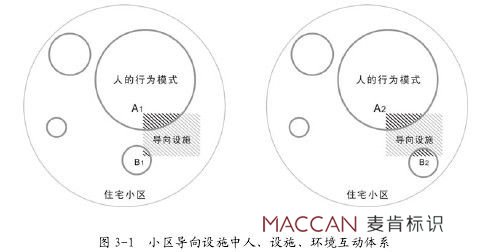 住宅小區(qū)導(dǎo)向設(shè)施中人、設(shè)施和環(huán)境的互動(dòng)體系實(shí)質(zhì)是一個(gè)動(dòng)態(tài)的、連續(xù)性的過(guò)程,而不是某個(gè)靜止的、片段的動(dòng)作行為(見(jiàn)圖 3-1)。因?yàn)槿说男袨槟J接屑榷ǖ囊?guī)律部分也有很多隨機(jī)的部分,由此帶來(lái)了此互動(dòng)體系中一些較固定的行為現(xiàn)象(如圖中的交集 A1 和 A2),同時(shí)也存在一些動(dòng)態(tài)變化的部分(如圖中的交集 B1 和 B2)。