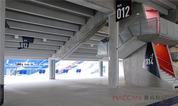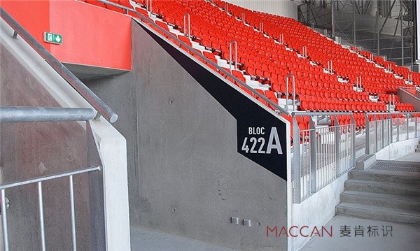 場館內(nèi)導(dǎo)向標(biāo)識的主要作用是幫助觀眾對號入座,并指示樓梯、電梯、衛(wèi)生間等公共服務(wù)設(shè)施。根據(jù)位置不同,可分為看臺標(biāo)識和集散廳標(biāo)識兩類。