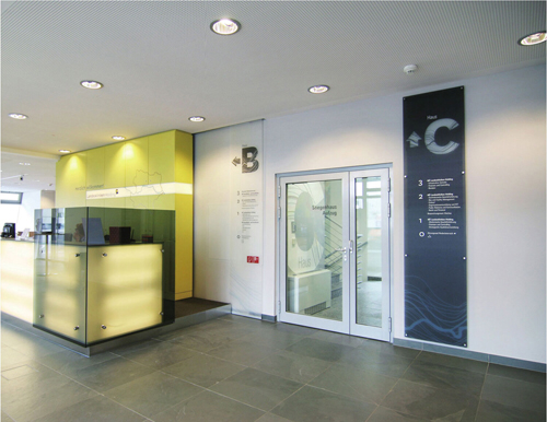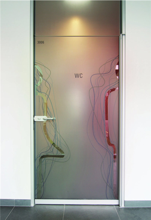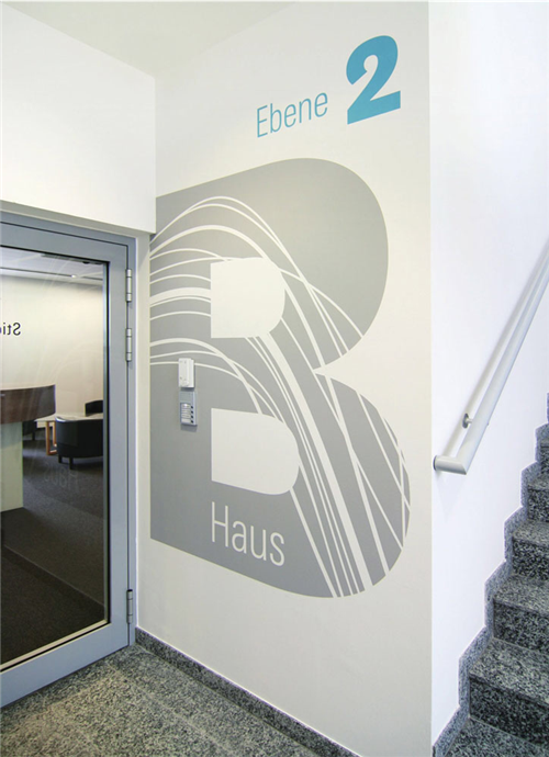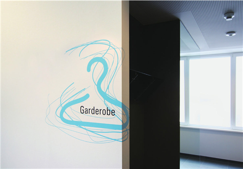 企業(yè)藍色線狀結(jié)構(gòu)的企業(yè)標(biāo)識從墻壁遍布到門上,這種有設(shè)計美感的象形圖都讓品牌文化增色不少。(來源:全球經(jīng)典標(biāo)識與導(dǎo)視設(shè)計)