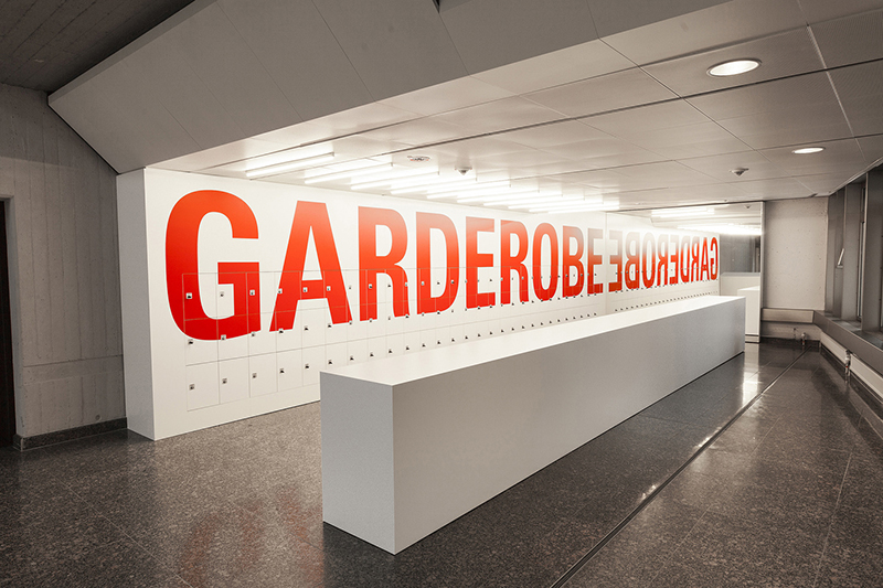 設(shè)計(jì)師采用易于使用的標(biāo)識(shí)系統(tǒng)進(jìn)行建筑空間布局的說明導(dǎo)航。在每一層的墻面上設(shè)置了超大醒目的紅色文字標(biāo)識(shí),保證在各個(gè)角度都容易被發(fā)現(xiàn)和看見,清晰明確地提供引導(dǎo)幫助。并且為了更加經(jīng)濟(jì)高效的工作,員工可以使用設(shè)計(jì)團(tuán)隊(duì)開發(fā)的模板自行打印標(biāo)簽,黏貼在可提供信息的位置即可。簡(jiǎn)化的白色藝術(shù)空間與強(qiáng)大的視覺語言毫無違和感,加強(qiáng)了參觀者的的文化藝術(shù)體驗(yàn)。