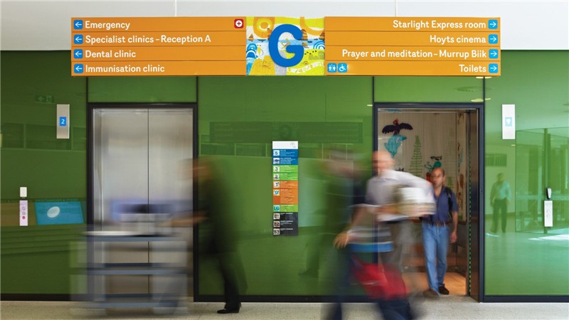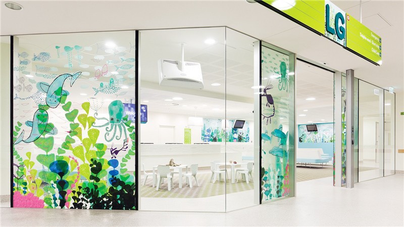 設(shè)計(jì)公司與插畫(huà)師Jane Reiseger合作為其創(chuàng)建了環(huán)境圖形設(shè)計(jì)和導(dǎo)視系統(tǒng)設(shè)計(jì)。整個(gè)設(shè)計(jì)的色彩靈感來(lái)自醫(yī)院標(biāo)志本身,基本圍繞標(biāo)志中的黃色、綠色、橘紅色、紅色、天藍(lán)色和深藍(lán)色為主要色調(diào)。設(shè)計(jì)師運(yùn)用了輕松的線條和色彩的搭配,繪制了大面積的墻壁插畫(huà),為醫(yī)院增添了樂(lè)趣和活力,營(yíng)造了一種豐富的視覺(jué)效果,讓患者、家長(zhǎng)甚至是護(hù)士在這里感到放松和愉悅,舒緩了他們的緊張感。導(dǎo)視系統(tǒng)在設(shè)計(jì)上與建筑環(huán)境保持了整體的統(tǒng)一性,簡(jiǎn)潔表達(dá),與室內(nèi)豐富多彩的裝飾形成鮮明對(duì)比,醒目但不突兀。對(duì)于如今很多一味追求硬件高大上的建筑來(lái)說(shuō),這座充滿愛(ài)和趣味的兒童醫(yī)院,充滿人性的關(guān)懷,讓建筑回歸服務(wù)人的本質(zhì)。最重要的是豐富的標(biāo)識(shí)視覺(jué)效果,讓患者、家長(zhǎng)甚至是護(hù)士在這里感到放松和愉悅,舒緩了彼此之間的緊張感。