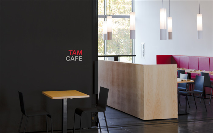 導(dǎo)視系統(tǒng)的材料的色彩元素參考了原始建筑:Antoine Predock的現(xiàn)代主義銀盒以及Olson Kundig建筑事務(wù)所的的新建筑,并采用當?shù)刂圃斓纳钭厣玆ichlite工業(yè)材料。明亮的不銹鋼與暗黑的工業(yè)鋼、TAM標志性的紅色品牌顏色進行鮮明的對比,簡單優(yōu)雅的導(dǎo)視系統(tǒng)加強了博物館在國內(nèi)外的形象,并促進吸引更多樣化的訪客。