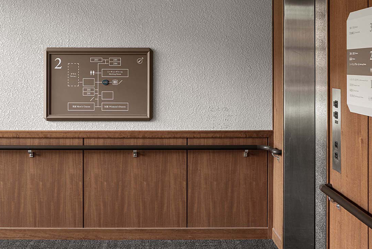 大丸山酒店于2020年關(guān)閉的酒店改造而成,現(xiàn)為一家溫泉酒店擁有宴會(huì)廳、客房、溫泉和會(huì)議室等設(shè)施,MON公司受邀為其進(jìn)行導(dǎo)視系統(tǒng)設(shè)計(jì)。