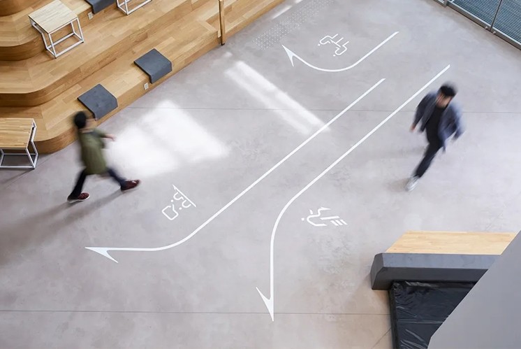 設(shè)計(jì)團(tuán)隊(duì)以美津濃的品牌標(biāo)志“Run Bird”為靈感,創(chuàng)造了一套獨(dú)特的箭頭形狀標(biāo)識(shí)。這些箭頭不僅在視覺上傳達(dá)了美津濃品牌的動(dòng)感與活力,更以其俏皮和創(chuàng)新的形態(tài),為整個(gè)空間增添了一抹趣味性。箭頭成為了空間中流動(dòng)的藝術(shù)品,引導(dǎo)人們穿梭于各個(gè)創(chuàng)新實(shí)驗(yàn)室和合作區(qū)域。