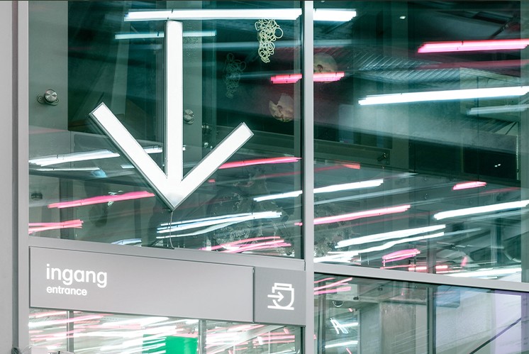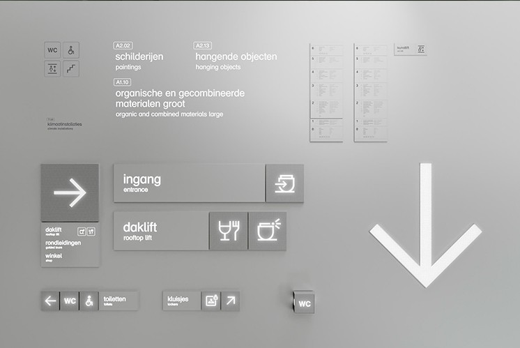 為進(jìn)一步提升游客的體驗(yàn),Silo公司承擔(dān)了Depot倉庫的導(dǎo)視系統(tǒng)設(shè)計(jì)任務(wù)。在入口處精心設(shè)計(jì)了一個巨大的數(shù)字面板,面板不僅是信息的展示窗口,也是連接游客與藝術(shù)世界的橋梁。面板上不僅實(shí)時顯示著游客信息,還生動地展示了建筑物的橫截面圖,以及關(guān)于建筑內(nèi)藝術(shù)品收藏和氣候控制區(qū)域的詳細(xì)數(shù)據(jù)。通過實(shí)時攝像頭,游客可一窺大樓內(nèi)部的實(shí)時動態(tài),互動性極強(qiáng)的設(shè)計(jì),參觀充滿了驚喜和新鮮感。