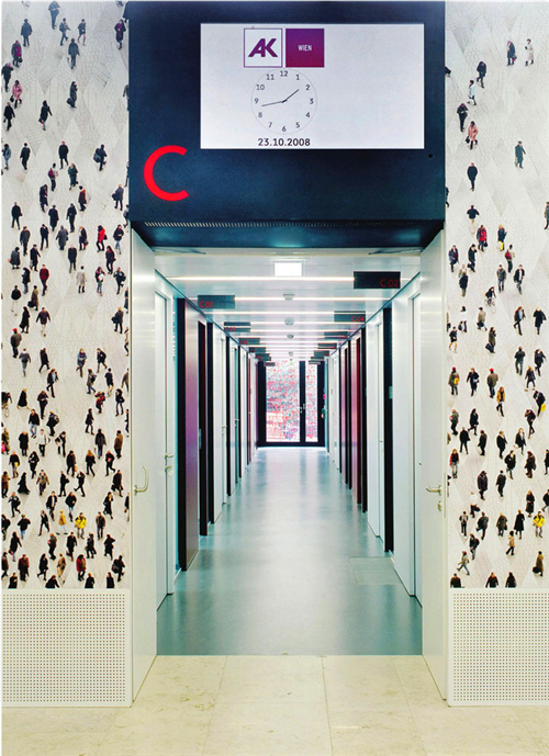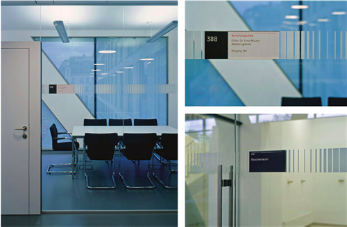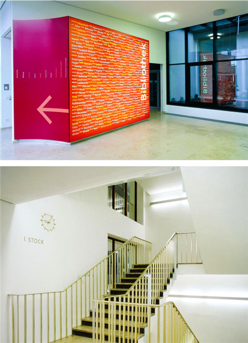 在大樓的導(dǎo)視系統(tǒng)中,另外一個(gè)很重要的特點(diǎn)就是在現(xiàn)代的設(shè)計(jì)中,仍能體現(xiàn)出大樓的歷史特點(diǎn),這些體現(xiàn)在對(duì)AK大樓特別選用的材料及字體設(shè)計(jì)。整個(gè)系統(tǒng)的Soleil字體包括符號(hào)和大小寫字母等都是與專業(yè)字體設(shè)計(jì)師Wolfgang Homola合作的設(shè)計(jì)作品。