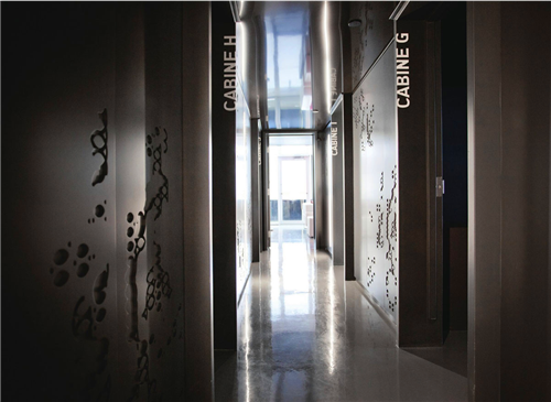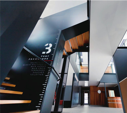 建筑物的內(nèi)部幾乎以全黑和深灰為主色調(diào),這種設(shè)計(jì)給人的第一感覺是壓抑,這一點(diǎn)與人們認(rèn)識(shí)的傳統(tǒng)水療機(jī)構(gòu)有比較大的差別,這樣強(qiáng)烈的對(duì)比卻能讓客戶沉醉在寧?kù)o而冥想的空間里,更好地享受水療。