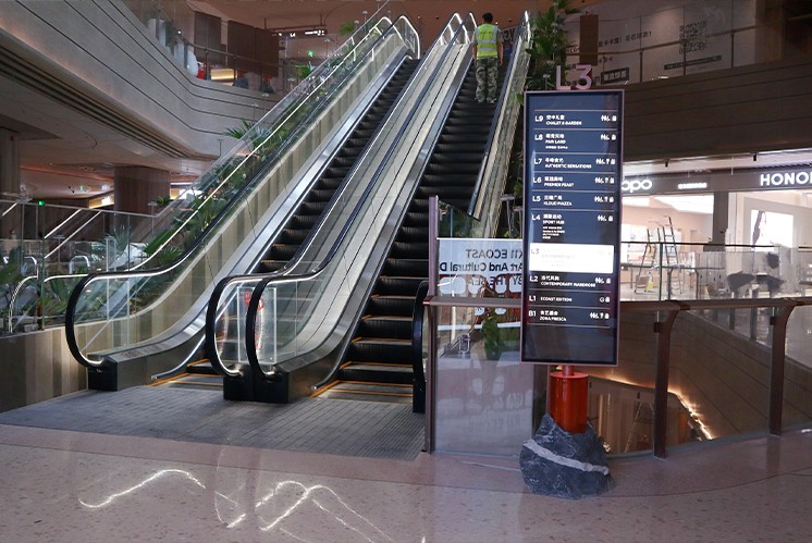 導(dǎo)視系統(tǒng)的設(shè)計(jì)緊隨建筑設(shè)計(jì)理念,巧妙地將自然與現(xiàn)代材質(zhì)相結(jié)合。導(dǎo)視系統(tǒng)采用石頭與樹脂精心打造的圓柱體,搭配質(zhì)感十足的不銹鋼與玻璃材質(zhì),既彰顯出自然的質(zhì)樸與堅(jiān)韌,又融入了現(xiàn)代建筑的簡(jiǎn)潔與精致。在視覺上,導(dǎo)視系統(tǒng)與 K11 ECOAST 整體的建筑風(fēng)格相得益彰,更在細(xì)節(jié)之處體現(xiàn)了對(duì)環(huán)境的尊重與融合,仿佛是自然與藝術(shù)的對(duì)話,為訪客指引方向,也成為空間中不可忽視的藝術(shù)裝置。
