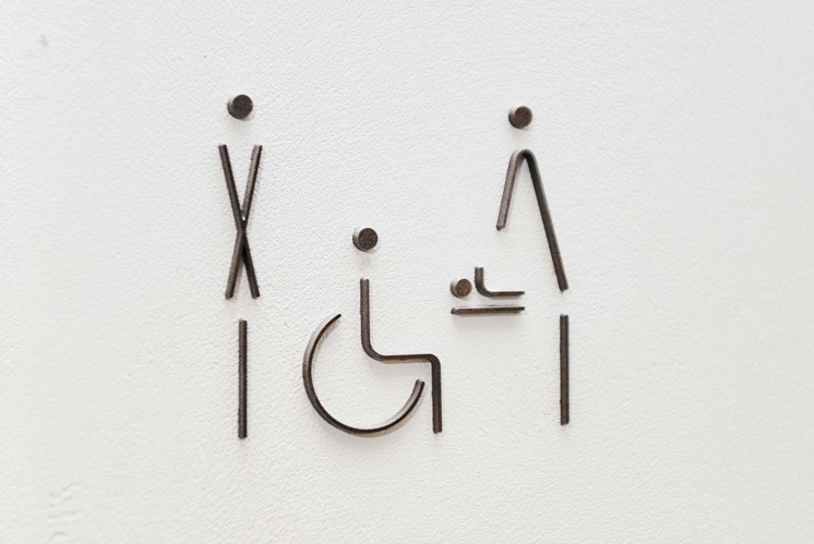 具體到執(zhí)行層面,標(biāo)識(shí)的材質(zhì)與形式語(yǔ)言精妙詮釋了“質(zhì)感”與“玩趣”的平衡。洗手間標(biāo)識(shí)采用極度細(xì)長(zhǎng)的無襯線字體,線條凝練純粹,毫無冗余裝飾,以現(xiàn)代極簡(jiǎn)主義手法確保了瞬間識(shí)別的效率,其純粹形態(tài)在環(huán)境中優(yōu)雅隱現(xiàn)。與之形成有趣對(duì)話的是仿皮革紋理的金屬導(dǎo)視牌。金屬的冷峻現(xiàn)代感被精心處理的仿皮革表面溫柔化解,呈現(xiàn)出一種獨(dú)特而高級(jí)的溫潤(rùn)觸感與視覺層次。這種材質(zhì)創(chuàng)新不僅提升了品質(zhì)感,其擬態(tài)趣味更在無形中軟化了指引信息的刻板印象,增添一絲親和與驚喜,成為“玩趣都市風(fēng)”最直觀的注腳。