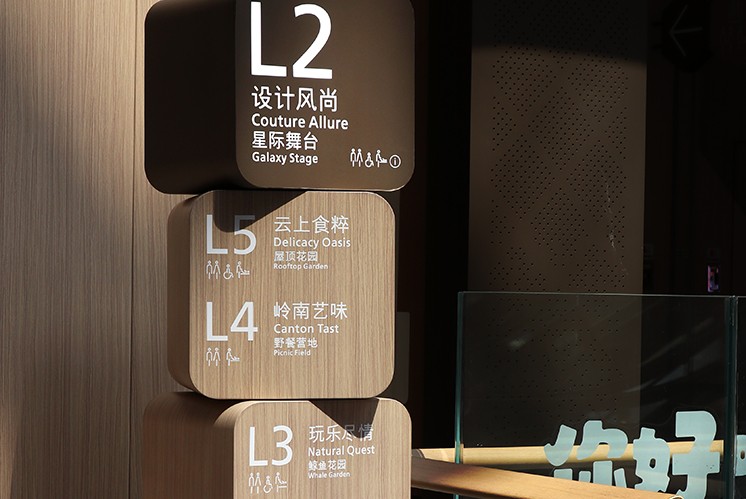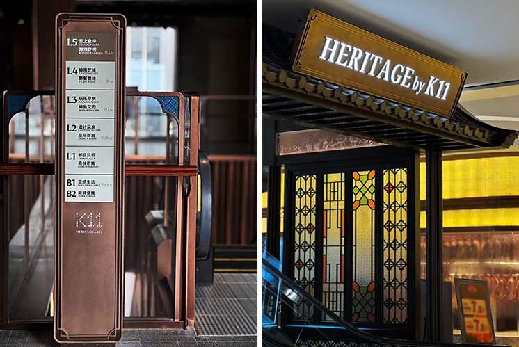 當(dāng)腳步抵達(dá)頂層美食區(qū),導(dǎo)視系統(tǒng)又化身 “嶺南文化的傳譯者”。在 HERITAGE by K11 區(qū)域,嶺南中國(guó)風(fēng)被演繹得淋漓盡致:導(dǎo)視牌與嶺南特色空間融為一體。標(biāo)識(shí)指引在復(fù)古框架中熠熠生輝,仿佛在訴說(shuō)嶺南商貿(mào)與飲食文化的百年故事。