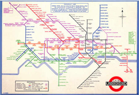 1933年,英國設計師哈里貝克對英國倫敦地鐵交通體系圖進行了設計,簡明扼要、色彩鮮明的鐵路路線,圓圈標明路線交叉點,重視線路走向、交叉和線路的區(qū)分。這個地圖設計具有非常高的視覺傳達功能性,從此這個設計也奠定了全世界交通圖的設計基礎。