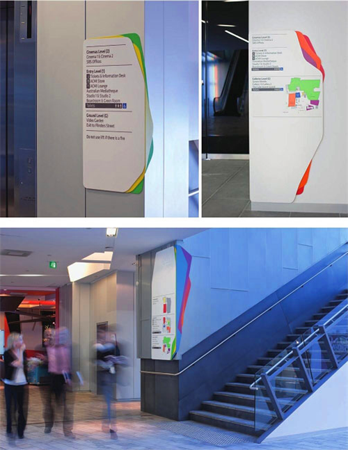 本案是Buro North公司為一家位于聯邦廣場的澳大利亞移動影像中心開發(fā)的導視設計。其地點與環(huán)境的設計重點在于遵循步行者從公共交通樞紐、弗林德斯河大街到聯邦廣場的路線習慣,并以此為依據,采用不同的標識元素完成設計。