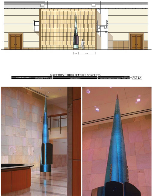 3003 Perimetre Summit大廳中這一引人注目的尖塔結構是Lorenc+Yoo Design公司和Hines密切合作的另一主要成果。這是一座底部直徑接近1米、高6.7米的玻璃塔,由297塊大小不一、厚1.9厘米的玻璃板堆砌而成。每塊玻璃板邊緣都通過手工拋光打磨,在燈光的映襯下,營造出光怪陸離的視覺效果。直徑約為17厘米的中心孔洞是為通電預留的位置,光纖電纜可以從中自上而下穿過。整個尖塔物體的底端和頂端都是采用不銹鋼制成的。