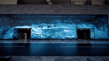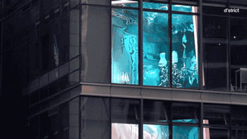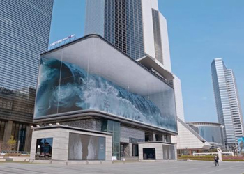 再走近細(xì)細(xì)一看,這“水缸”竟是一塊巨大的LED曲面屏,整塊屏幕安裝在建筑樓頂。