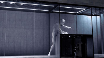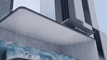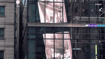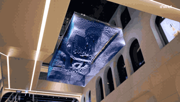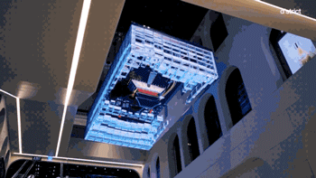 再來(lái)看看這塊屏幕有多神奇。一塊屏幕斜在建筑內(nèi),透過(guò)建筑外立面的玻璃你就能感受到不一樣的VR體驗(yàn)。