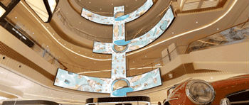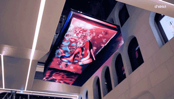 商場(chǎng)里大堂天花板,用一塊尺寸為3.5m X 6m X 1.5m的立方體LED屏倒掛在天花板。