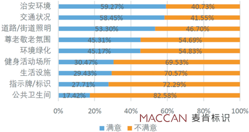 第4次中國城鄉(xiāng)老年人生活狀況抽樣調(diào)查數(shù)據(jù)顯示,老年人對社區(qū)環(huán)境中各個項目的滿意度普遍較低。數(shù)據(jù)顯示,治安環(huán)境的滿意度最高,不足60%,標(biāo)識牌/標(biāo)識的滿意度低下,僅為27.71%,滿意度水平有待提升。