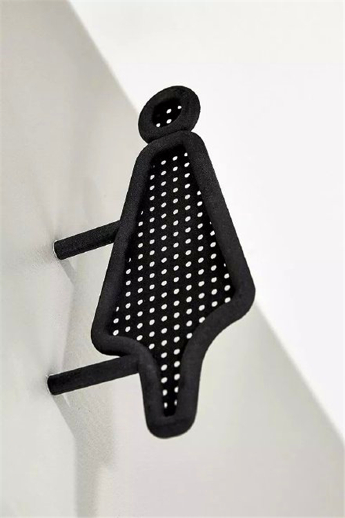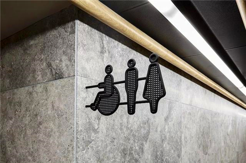 標識設計采用了3D打印技術制作標牌,圓點網(wǎng)眼和圓潤的icon使標牌看起來更加精致具有質(zhì)感。整套導視系統(tǒng)采用無襯線字體,更具現(xiàn)代化,易于辨識。黑白色的配色與環(huán)境高度融合,形成統(tǒng)一的視覺系統(tǒng)。