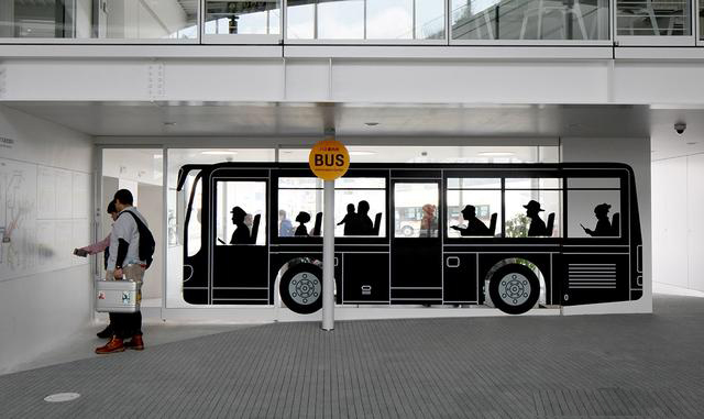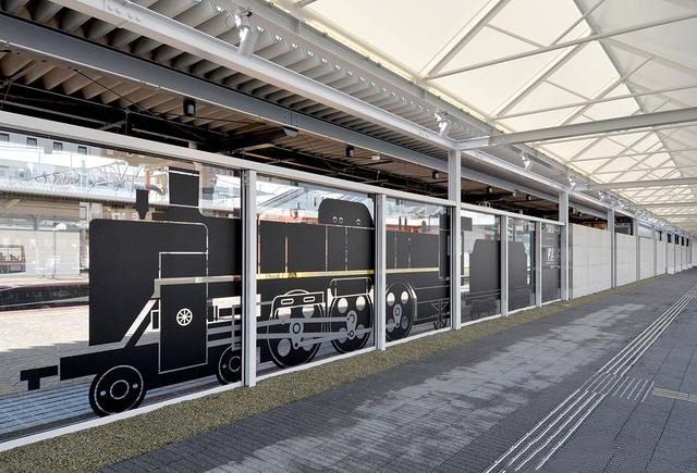 本套設(shè)計(jì)由KDM設(shè)計(jì)公司負(fù)責(zé),為了體現(xiàn)地區(qū)文化特性,增加游玩趣味,除了從JR檢票口到廣場(chǎng)簡(jiǎn)潔易識(shí)別的導(dǎo)視外,還有各種墻面圖形等平面設(shè)計(jì)來(lái)豐富整個(gè)空間,包括火車(chē)頭、出租車(chē)等。