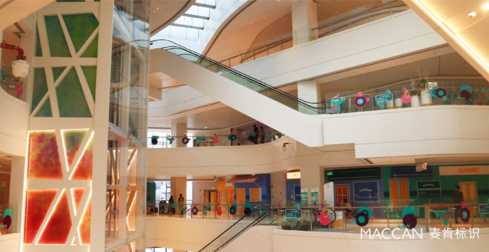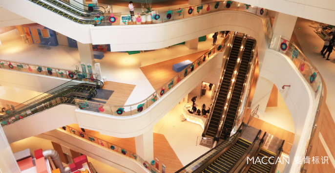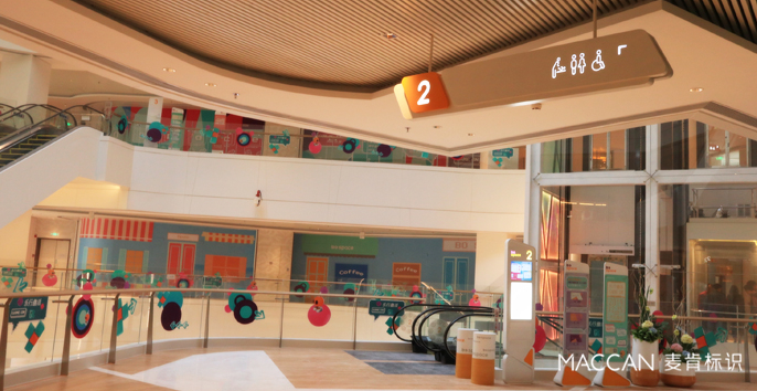 麥肯利用導(dǎo)視信息的碎片平面和合理分配,增加簡(jiǎn)潔時(shí)尚的設(shè)計(jì)圖案,將整個(gè)區(qū)域打造成了休閑放松、愜意漫步的購(gòu)物空間,極大滿足了消費(fèi)者的心理。